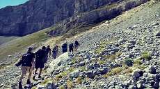 Alla partenza, ore 16, il tempo è sereno variabile, con temperatura intorno ai 26 gradi, piacevole e lieve vento e nuvoloni bianchi che corrono veloci: è usuale, ci viene detto dai nostri amici del luogo, che al pomeriggio si presentino queste condizioni climatiche. Attacchiamo immediatamente la parte più impegnativa del nostro percorso, con una salita su rocce che formano una sorta di scalinata molto ripida, abbastanza coperta dalle maestose conifere: di sicuro non c’è stato modo di rompere il fiato, ma è un approccio utile che avverte noi uomini di città che stiamo ‘salendo’, sia fisicamente sia come ‘contesto’ ambientale. Questo tratto può essere percorso, con un normale allenamento, in circa 35 minuti, ma il nostro gruppo impiega circa 50 minuti per attendere uno dei nostri che, pur di non perdersi questa esperienza, ha deciso di partire con noi nonostante un infortunio occorso in una recente escursione.