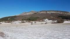 È con questo proposito che una mattina, sfruttando le festività natalizie, siamo andati, la fedele amica a quattro zampe Mera ed io, ai picchi di Aielli, in provincia dell’Aquila. Raggiunta Castel Paganica, nella piana di Montereale e lasciata la macchina sulla strada che sale per il Monte Mozzano, una paziente camminata su strada sterrata, dopo un paio di tornanti, ci ha portato alla croce di Aielli, che segna 1179 metri. La giornata è fredda, ma il sole splende basso sull’altipiano, incontrastato da alcuna nuvola.