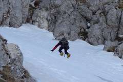 Arriviamo all’imbocco del canale 1° maggio, purtroppo martoriato dai solchi lasciati da precedenti salite in un’ambiente che, totalmente in ombra, è prettamente invernale. Proseguiamo slegati fino alla difficoltà vera e propria rappresentata da un muretto di 5 metri sui 55/60° che, in leggera esposizione, affrontiamo in una specie di misto ghiaccio/neve/erba/roccia. Saliamo in parte slegati ed in parte assicurati, anche per consentire un passaggio sicuro a chi porta gli sci sullo zaino, ed in meno di dieci minuti siamo fuori dalle difficoltà sul pendio sovrastante che sbuca in cresta. Il passaggio di per sé è carino, forse un po’ troppo breve rispetto al resto del canale che si tiene su pendenze che variano, crediamo, intorno ai 45/50°.