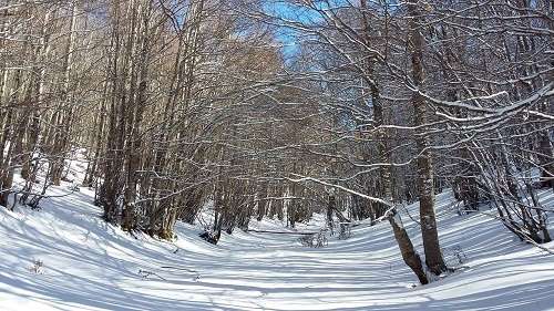 Proseguendo nella valle ci addentriamo nel bosco di faggi ed una quiete straordinaria ci accoglie. Assenza di vento, candore del manto nevoso, immobilità degli alberi e silenzio rotto solo dal rumore della soffice neve schiacciata dai nostri piedi.