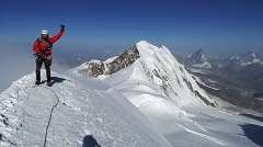E’ venerdì, sveglia tranquilla, non c’è fretta: si fa colazione ed un po’ di spesa per l’imminente salita giornaliera e via a prendere la funivia direzione Punta Indren. Dai 1700 metri circa di altitudine della partenza, in tre tronconi di funivia, si arriva a 3200 metri: purtroppo non è il massimo per l’acclimatamento, ma il tempo a disposizione non è molto e la meteo tiene bello fino a sabato. In poche parole, per effettuare l’ascesa sui quattromila abbiamo una finestra stretta. Da Indren saliamo senza ramponi lungo l’omonimo ghiacciaio, sempre più “asciutto” a causa del riscaldamento, verso il grande salto roccioso e, attraverso qualche divertente passaggio attrezzato, arriviamo sul soprastante ghiacciaio del Garstelet. Siamo a meno di 200 metri dal rifugio Capanna Gnifetti, la nostra dimora sul Monte Rosa. In meno di venti minuti, sotto un sole che picchia forte, un largo traverso ci conduce sulla panoramica terrazza del rifugio, vero nido d’aquila a 3650 metri. Sono le 12 e la nostra giornata da qui in poi sarà di acclimatamento e riposo.