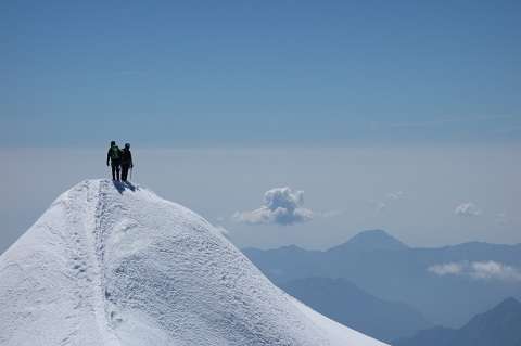 Inizia il primo traverso, poi il secondo, e poi ancora un altro, lungo la traccia battuta dalle cordate che già sono salite e su di una neve che, come ci avevano detto al rifugio, è buona e “scrocchiarella”. Procediamo di conserva e con la distanza di corda leggermente accorciata, senza troppi affanni ma sempre concentrati perché, lo sappiamo bene, da queste parti non si può e non si deve cadere. Arriviamo in prossimità del passaggio che, da sotto, avevamo visto rallentare molto una cordata: il ghiaccio si alterna alla neve, il punto è infido ed è solcato da un crepaccio verticale da superare in rapidità. Sopra e sotto di noi il pendio è ripido, bisogna stare in bilanciamento nei passi che, mediante la progressione a triangolo, ci faranno superare la difficoltà senza problemi: uno sguardo esorcizzante alla profondità del crepaccio, individuati gli “appoggi” finali per i piedi, fuori il respiro e via, piccozza/ramponi/aria/equilibrio. L’adrenalina si percepisce, il silenzio ancora di più, il corpo e la mente sono protesi verso il superamento di quello che, a differenza di quanto segnalato dalle relazioni lette, si rivelerà il momento più ostico. Siamo a 4000 metri e nel pieno della parte tecnica della nostra avventura. Saliamo dritti sul pendio più verticale, un traverso verso sinistra ed eccoci al passaggio che tanto temevamo, in base alla relazione: la crepacciata terminale che precede gli ultimi 20 metri sui 50°. Il buco è inquietante e solca quasi tutta la parete nevosa sotto la vetta, ma per fortuna nel punto in cui passa la traccia, il taglio è ancora abbastanza chiuso: un paio di passi da fare con attenzione ed eccoci sull’impennata finale che, scalinata da chi ci ha preceduto, alla fine si rivelerà una bella e rapida salita in progressione incrociata. Siamo fuori, sul terrazzino prima della crestina finale. Davanti a noi vediamo l’infinito e l’eterno, un paesaggio che non si può descrivere perché ogni descrizione sarebbe riduttiva rispetto all’esperienza che stiamo vivendo. Il Cervino, il Bianco, il Gran Paradiso, i Lyskamm, ecc. ecc., tutto intorno è un quadro fatto di sole, cielo, vette, nevi, ghiacci, vento, orizzonti sconfinati che riempiono il cuore di incredibile leggerezza. Aspettiamo l’altra nostra cordata e, nel mentre, ne salutiamo una di tedeschi che arrivata in vetta ridiscenderà sul percorso di salita.